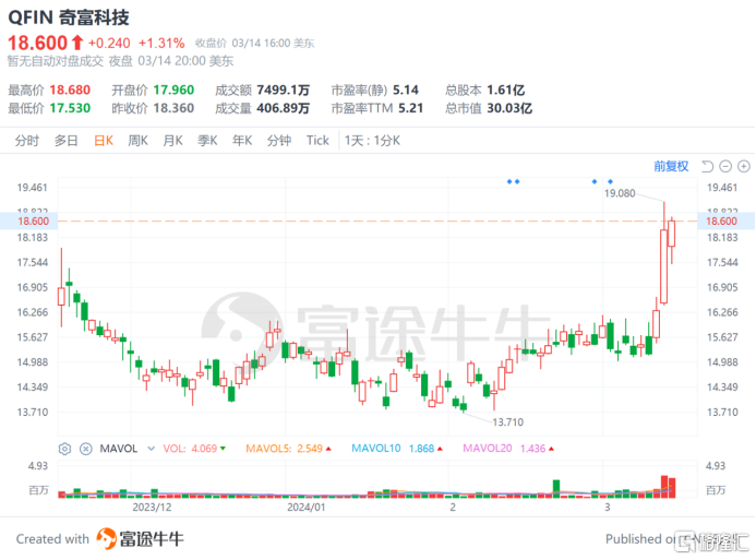 3月13日奇富科技公布2023年Q4及全年财报、宣派半年度股息及公布一项股份回购新计划,业绩公布后股价大涨超12%。
