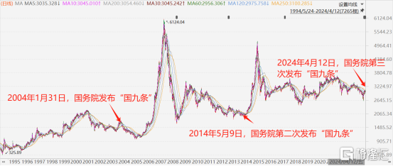 前两次的“国九条”,先后发布在2004年、2014年,为2007年沪指创出6124点、2015年创出5178点的大牛市行情埋下关键伏笔。