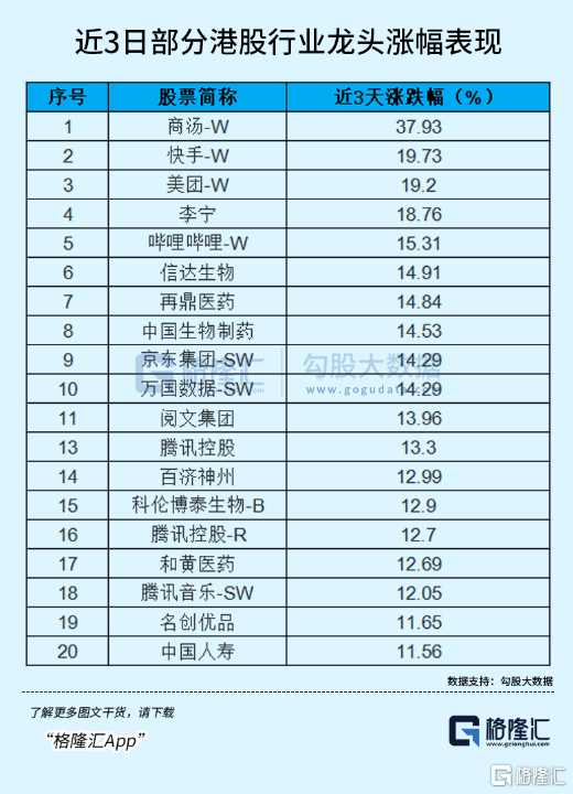 比如3天涨了20%左右的快手、美团、李宁,它们分别属于视频、电商、消费领域,还有一大堆涨幅可观的生物医药巨头等。