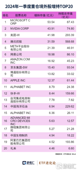 一季度投资境外股票的基金报告显示,基金增持TOP20中,除了微软、英伟达、META、亚马逊、博通、谷歌等国外科技巨头外,美团、快手、腾讯等也获得了大量加仓。