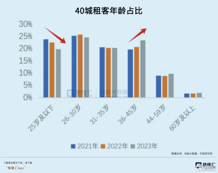 2023年,全国重点40城租赁成交中,35岁以上的租客占比超过35%,比2021年提升4.9%。