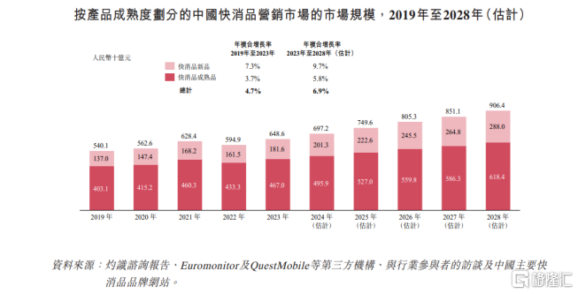 根据灼识咨询的数据,中国作为全球最大的消费市场之一,其消费品行业的市场规模在2023年已经达到了47.2万亿元,并有望继续扩大。预计到2028年,这一数字将达到60万亿元,年复合增长率为4.9%。