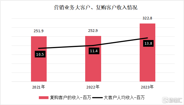 在客户覆盖上,品牌客户数从2021年的174名增至2023年的291名,大客户数从27名增长至47名大客户,大客户人均收入贡献以及复购客户的收入规模逐年提升。