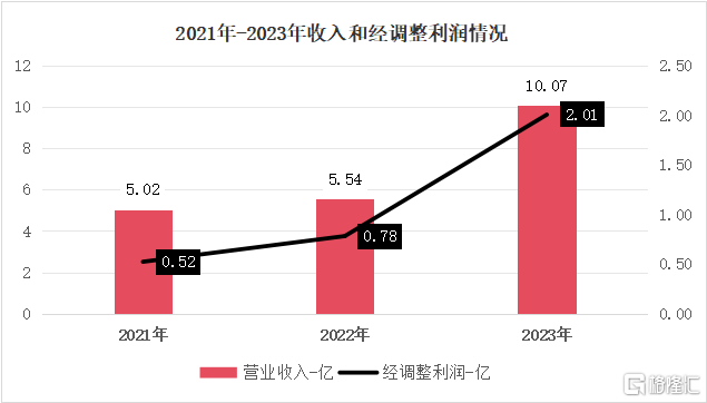 高增速领跑同行,充分展现了公司近年来强劲的增长势头。2021年至2023年,公司分别实现5.02亿、5.54亿、10.07亿的收入,年复合增长率达到了41.6%;在盈利能力上,公司2023年调整后利润超2亿元,年复合增长率达到了95.9%。