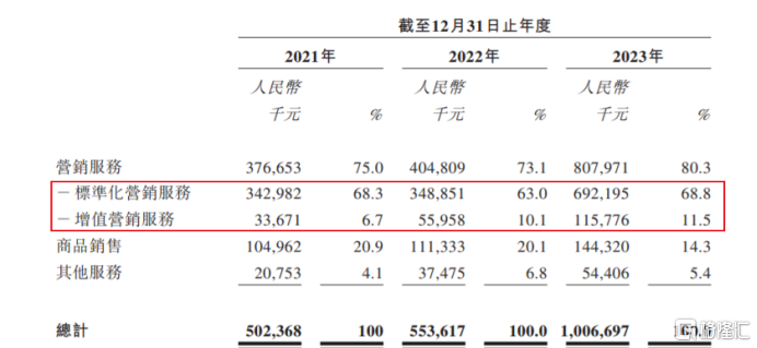 标准化营销服务作为公司的核心业务,近年来营收稳步增长,2021年-2023年,分别实现营收3.43亿、3.49亿、6.92亿,年复合增长率达42%。