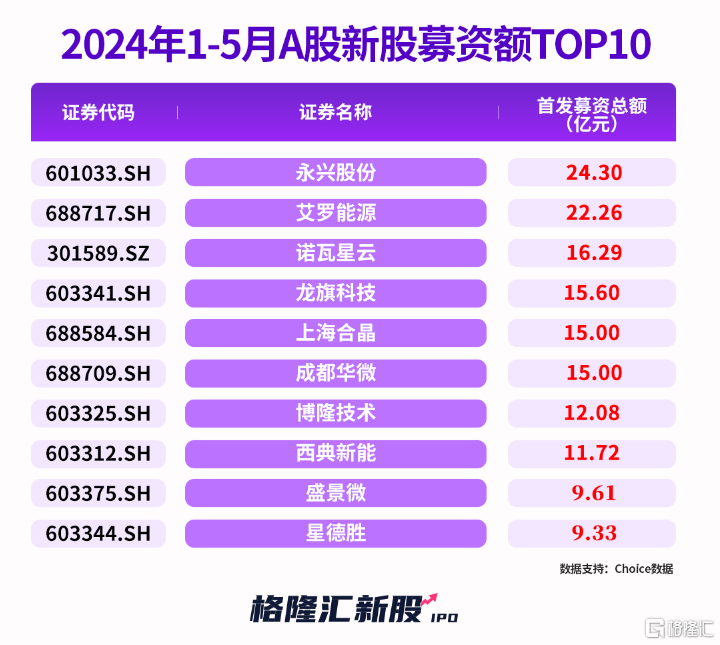 从募资额来看,5月登陆A股的公司中,首发募集资金最高的欧莱新材也仅募资3.84亿元,未能进入今年前5个月的新股募资额前十名。
