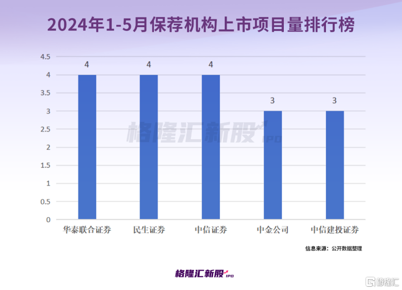 保荐机构方面,据统计,2024年前5个月参与A股IPO的保荐机构有20家。其中,中信证券、华泰联合证券、民生证券各有4家企业上市,并列第一,中金公司和中信建投证券各有3家企业上市,位列前五名。