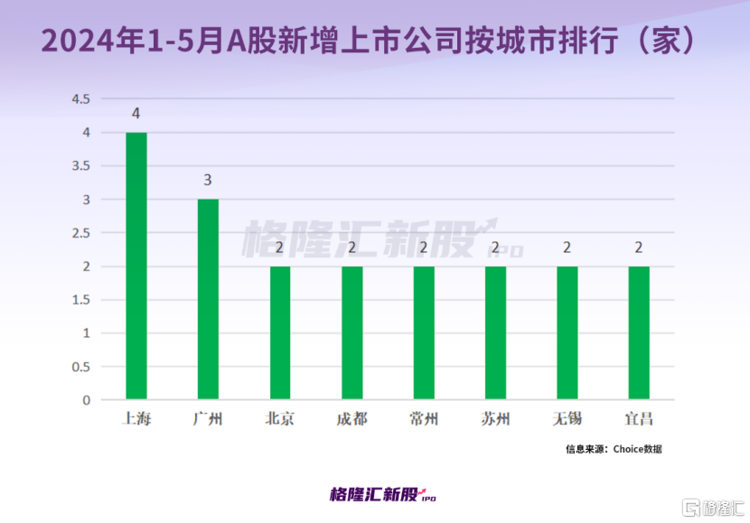分城市来看,今年新增A股上市公司最多的城市是上海,有4家企业成功上市;第二名的广州新增3家A股上市公司。