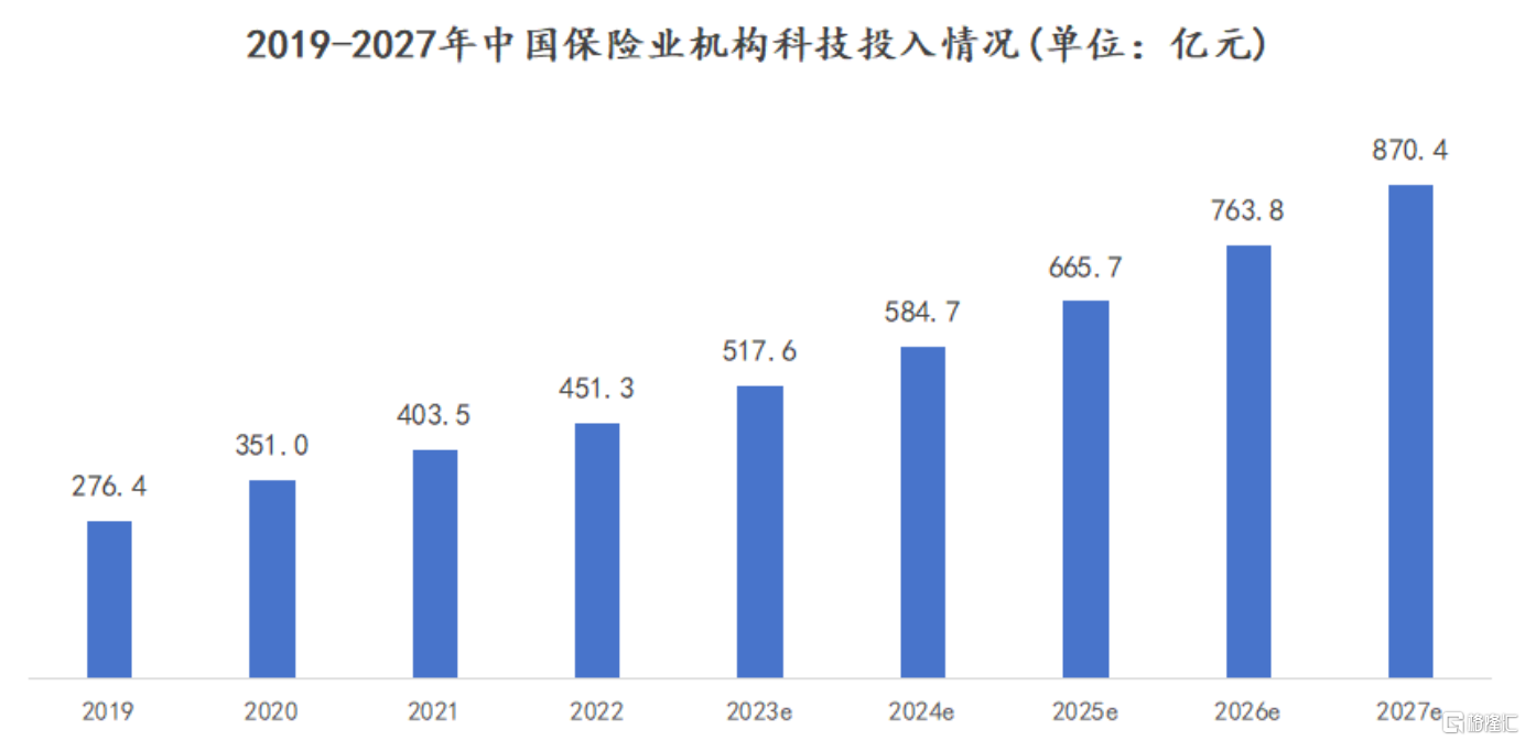 随着政策端持续加码,我国保险业研发费用不断上升。根据保险行业2023-2025年科技投入发展规划来看,伴随着投入的提升与前沿科技应用的逐步成熟,2023-2027年,国内保险科技市场将以约14%的复合增长率增长至870.4亿元。