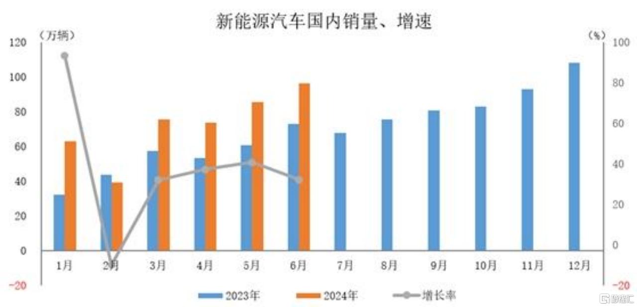 据中汽协数据,2024年1-6月,新能源汽车产销分别完成492.9万辆和494.4万辆,同比分别增长30.1%和32%。国内销量433.9万辆,同比增长35.1%;出口60.5万辆,同比增长13.2%。预计,2024年全年中国新能源汽车销量有望达到1150万辆,发展后劲十足。