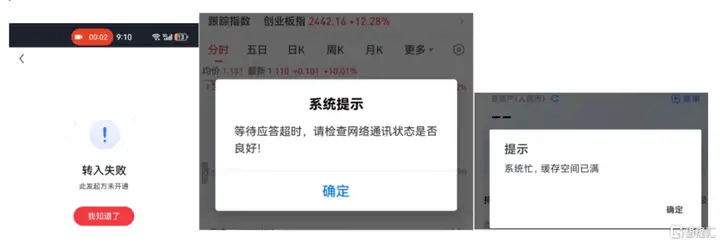 突发天量成交额,交易所提前扩容准备,强调券商IT等相关重要指标应在历史峰值三倍以上,但今日早盘多位不同券商用户反映,银证转账功能卡顿无法操作,钱无法转进和转出。