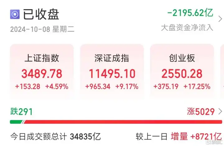 最终,沪指收涨4.59%报3489点,深成指涨9.17%,创业板指涨17.25%。全天成交3.45万亿元刷新历史新高,较前一交易日放量8589亿元,创历史记录的天量成交额!