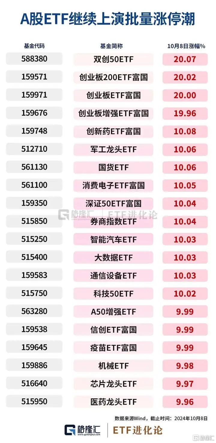 回看A股的今日的表现,ETF继续涌现批量涨停潮,创业板相关的ETF继续发挥牛市“20CM”最锋利矛的特色,从午间收盘的“20CM”22只到收盘一下子扩大至76只,两连板的创业板ETF富国(159971)9月24日至今累计涨幅高达78.35%。