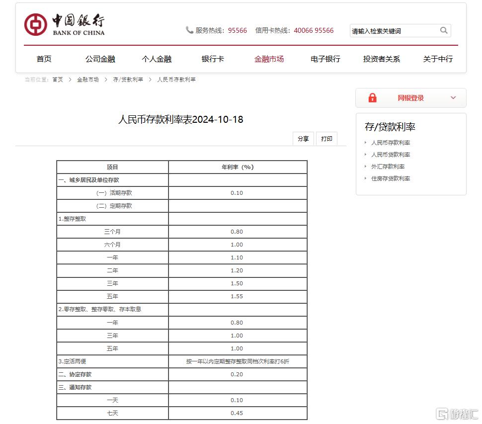 具体来看,中国银行官网显示,中国银行于10月18日下调了人民币存款利率,其中活期存款利率下调5个基点至0.1%;定期三个月期、半年期、一年期、三年期和五年期均下调25个基点,分别为0.80%、1.00%、1.10%、1.20%、1.50%和1.55%。