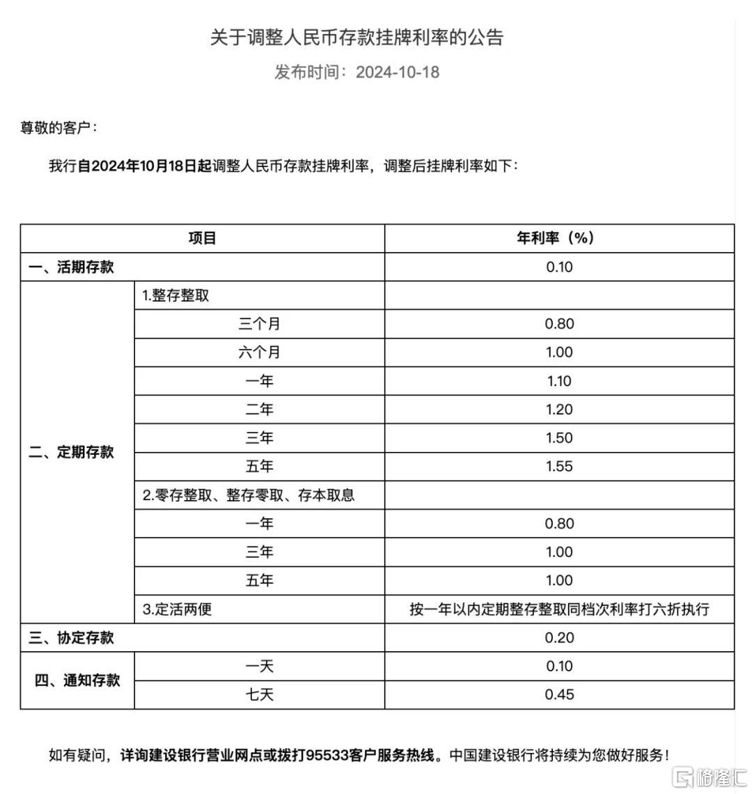 建设银行宣布,于10月18日下调了人民币存款利率,其中活期存款利率下调5个基点至0.1%;定期三个月期、半年期、一年期、三年期和五年期均下调25个基点,分别为0.80%、1.00%、1.10%、1.20%、1.50%和1.55%;7天期通知存款利率也同步下调25基点至0.45%。