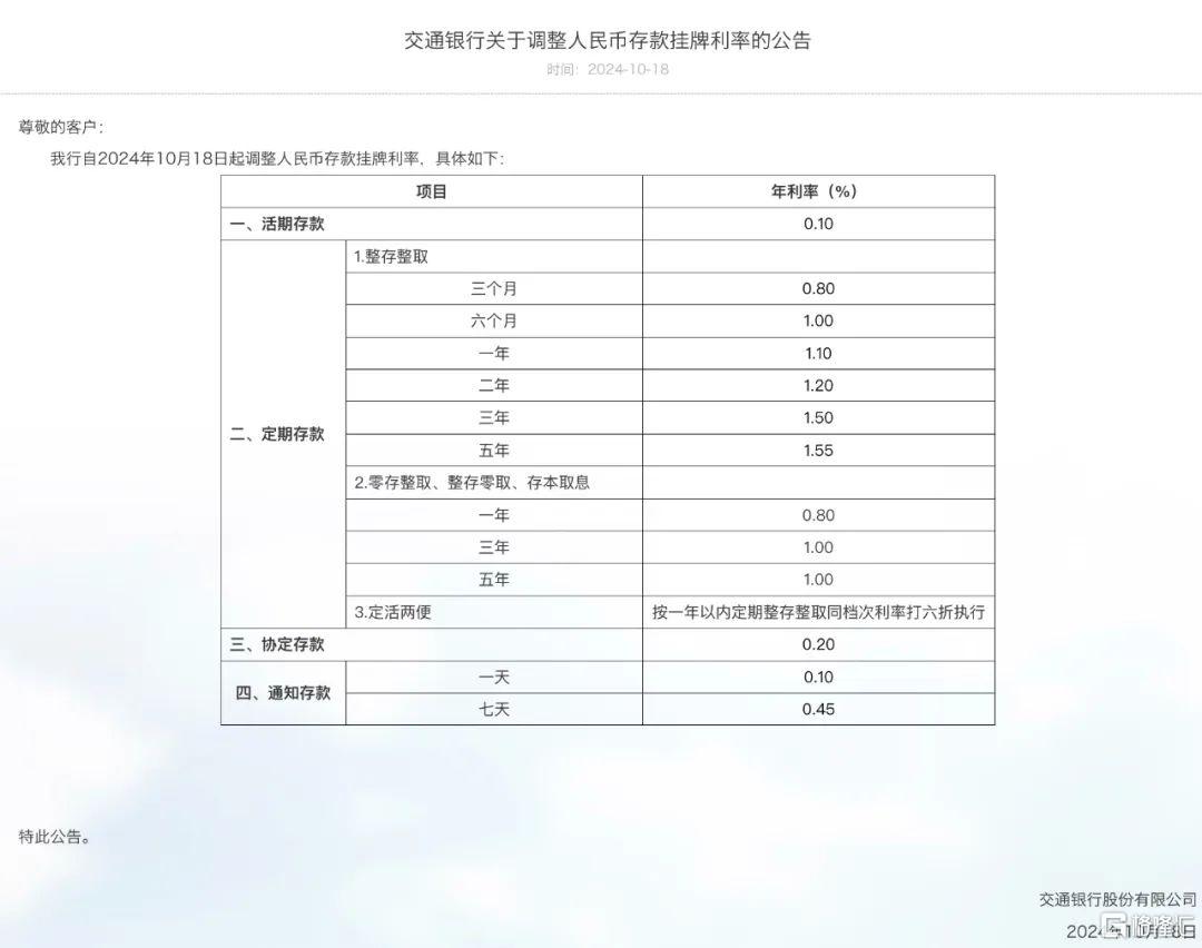 交通银行宣布,于10月18日下调了人民币存款利率,其中活期存款利率下调5个基点至0.1%;定期三个月期、半年期、一年期、三年期和五年期均下调25个基点,分别为0.80%、1.00%、1.10%、1.20%、1.50%和1.55%;7天期通知存款利率也同步下调25基点至0.45%。