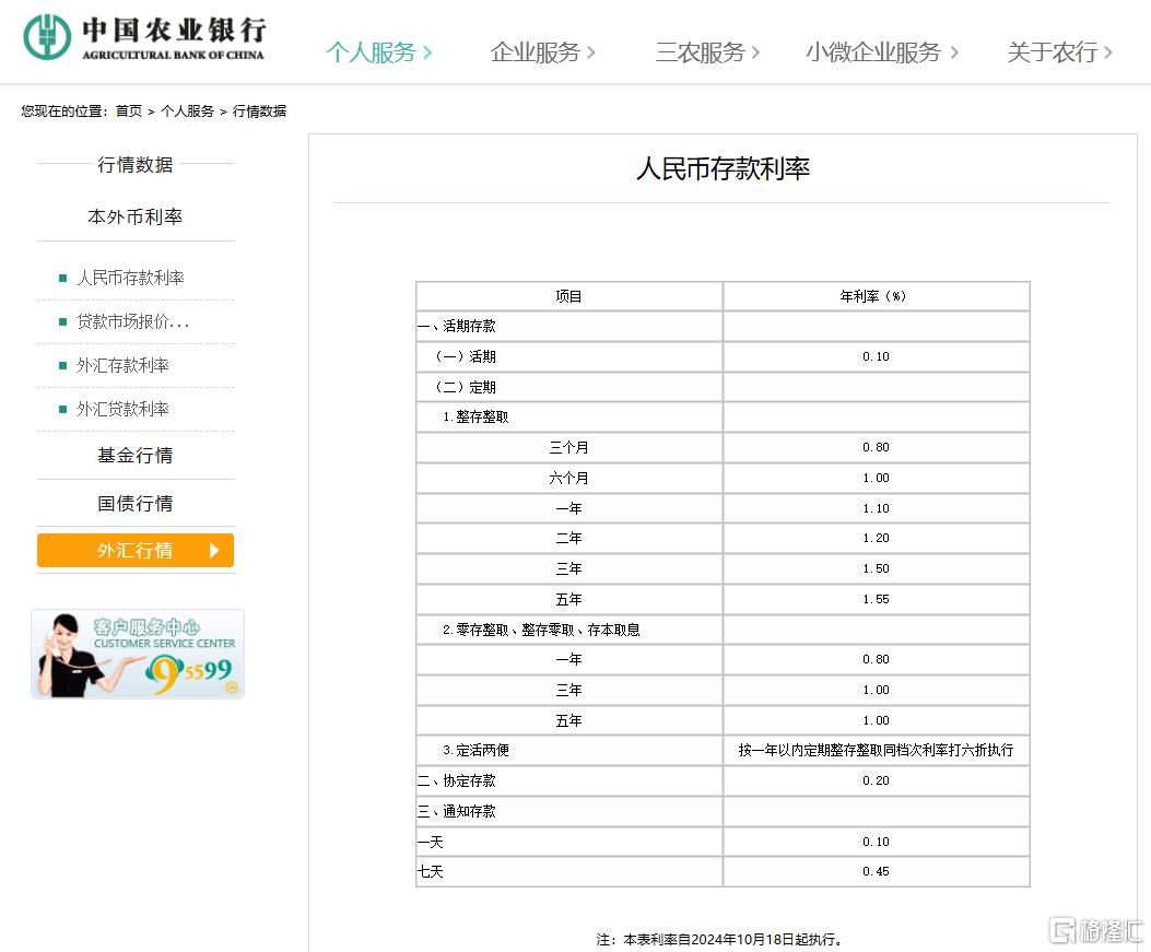 中国农业银行官网显示,农行于10月18日下调了人民币存款利率,其中活期存款利率下调5个基点至0.1%;定期三个月期、半年期、一年期、三年期和五年期均下调25个基点,分别为0.80%、1.00%、1.10%、1.20%、1.50%和1.55%;7天期通知存款利率也同步下调25基点至0.45%。