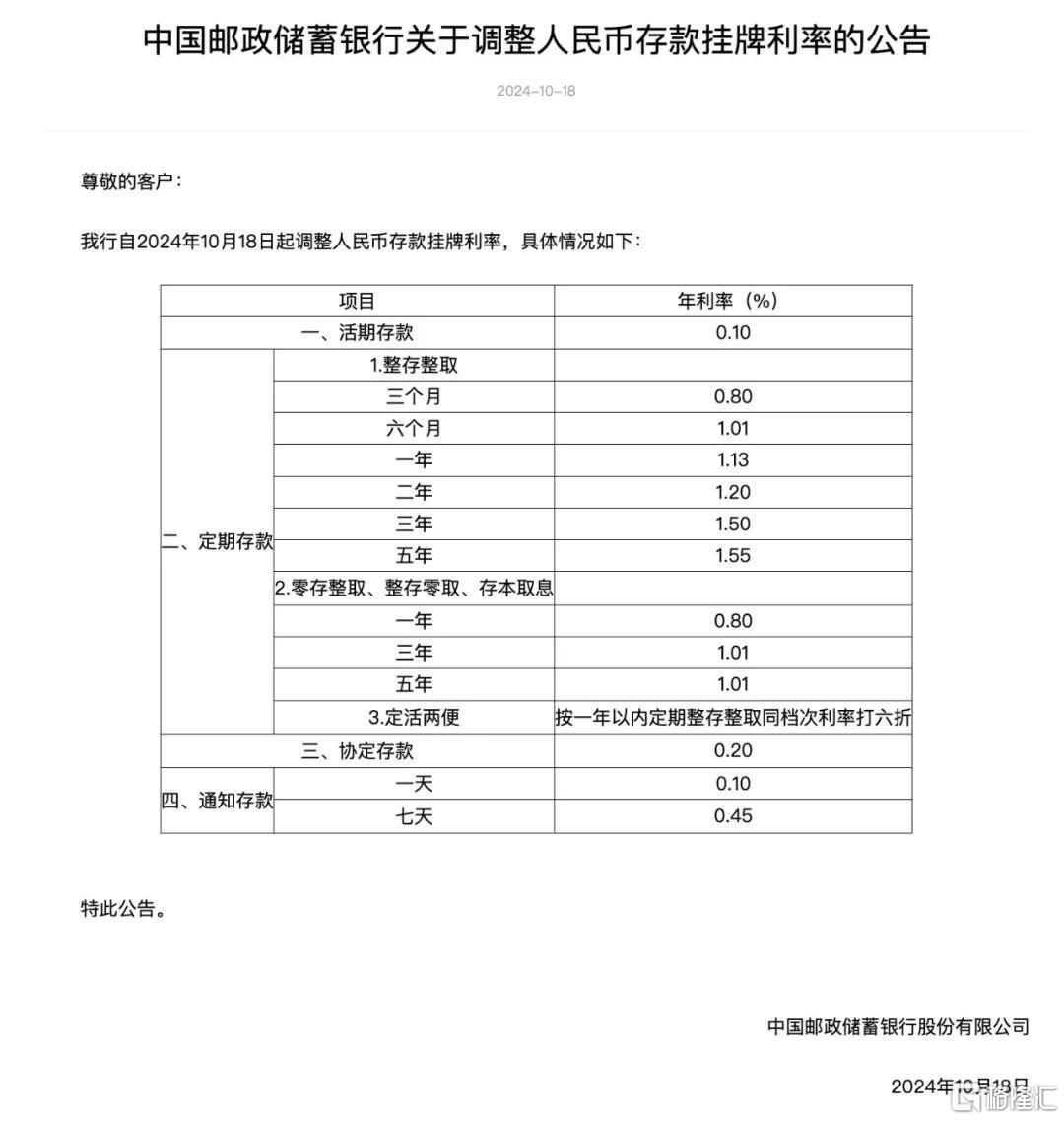 中国邮政储蓄银行宣布,自2024年10月18日起调整人民币存款挂牌利率,其中活期存款利率下调至0.1%;定期三个月期、半年期、一年期、三年期和五年期均有下调,分别为0.80%、1.01%、1.13%、1.50%、1.50%和1.55%。