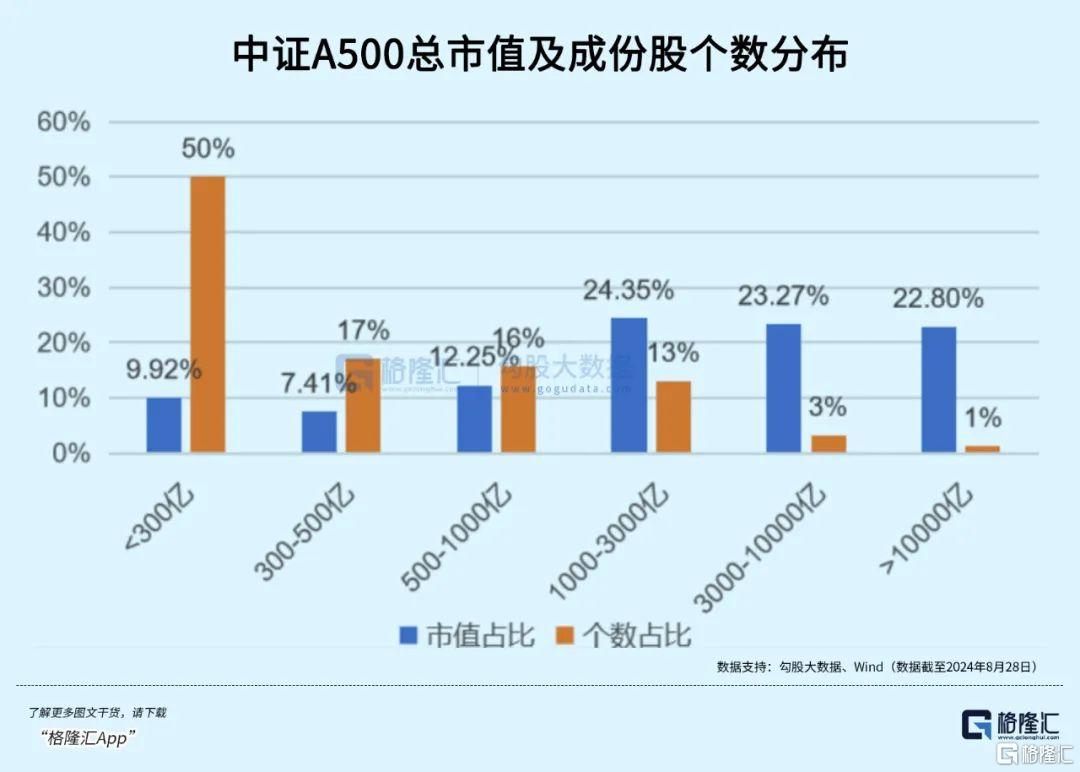 中证A500成份股中,有87只成份股市值在1000亿元以上,市值权重占比达70%;总市值1000亿元以下公司数量413只,数量占比达83%,其中包括众多行业细分龙头及新质生产力代表。