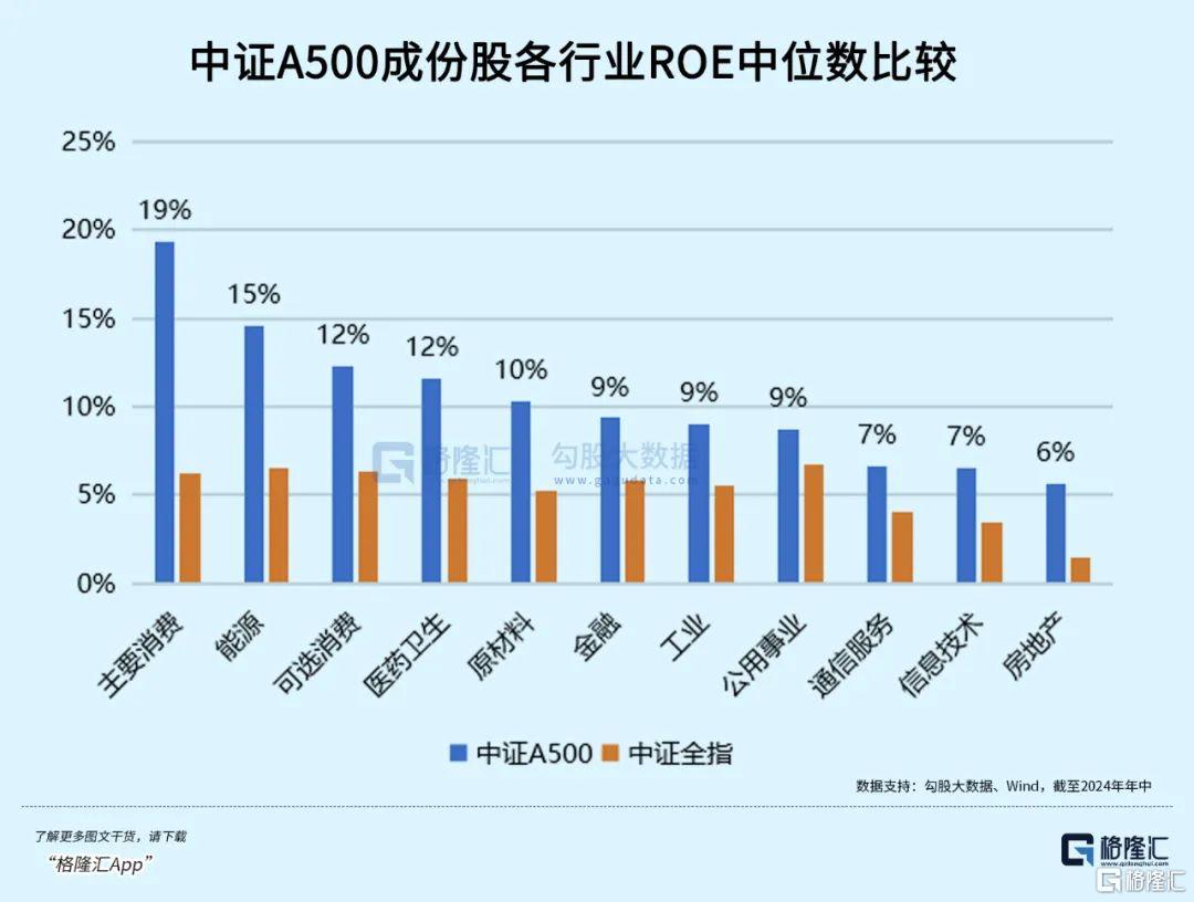 从近期业绩--2024年中报数据看,中证A500成份股净资产收益率为12.81%,远高于中证全指的8.51%;分行业看,中证A500成份股在各个行业中的净资产收益率中位数均高于中证全指;在可选消费、医药卫生、主要消费、工业、通信服务等新兴行业的营业收入增速中位数高于中证全指。