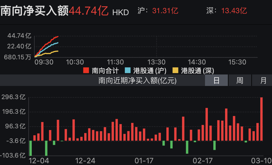 消息面上,南下资金昨日净买入296.26亿港元,创历史新高,今日继续净买入港股44.74亿港元。