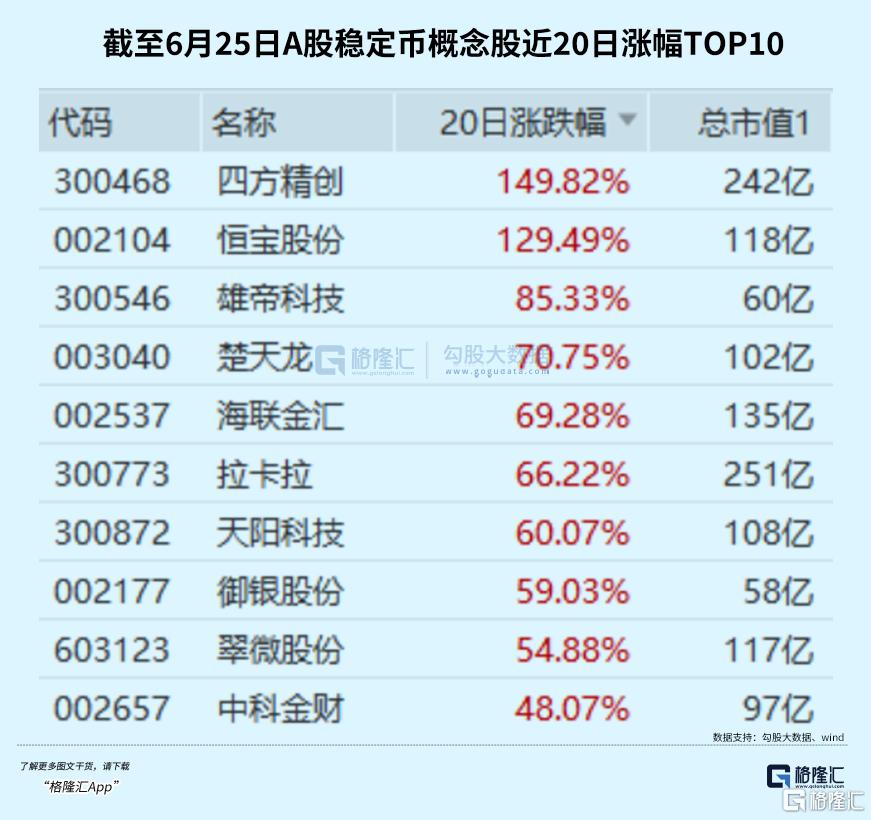 Wind数据显示,有稳定币相关概念传闻的四方精创股价开始连续大涨,近20日股价已经涨幅高达150%,恒宝股份涨幅达129.5%,还有不少与稳定币有关传闻的雄帝科技、楚天龙、数字认证、海联金汇、拉卡拉等金融科技概念股获得了数十个点的强劲上涨。