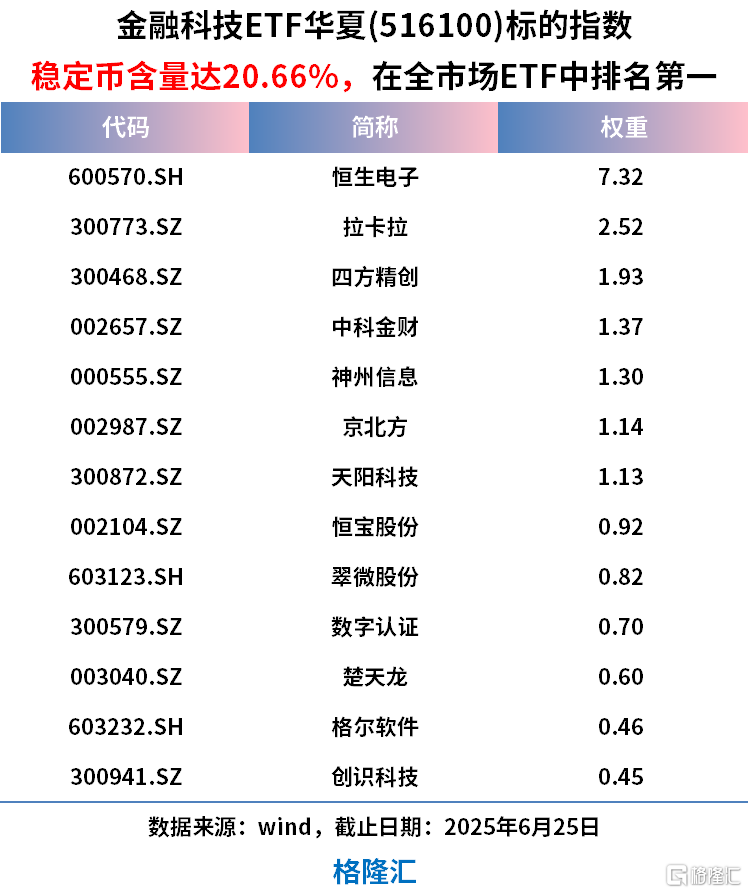 金融科技ETF华夏(516100)被动跟踪中证金融科技主题指数,涵盖软件开发、互联网金融及数字货币产业链,指数重仓股包括同花顺、东方财富、润和软件、恒生电子等行业龙头股,又不乏东信和平、赢时胜、拉卡拉、京北方、四方精创等稳定币热门个股,稳定币含量达20.66%,位居全市场ETF第一,场外联接基金023884/023885。