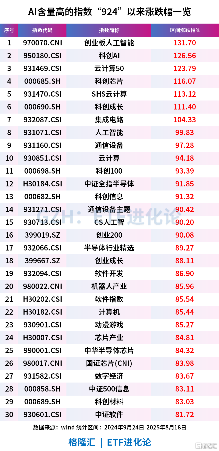 自“924”以来,与AI算力紧密相关指数强势霸榜,其中创业板人工智能指数以131.7%的涨幅,领涨全市场“AI含量高”指数,更偏科技上游的科创材料指数同期涨幅亦高达83.07%。