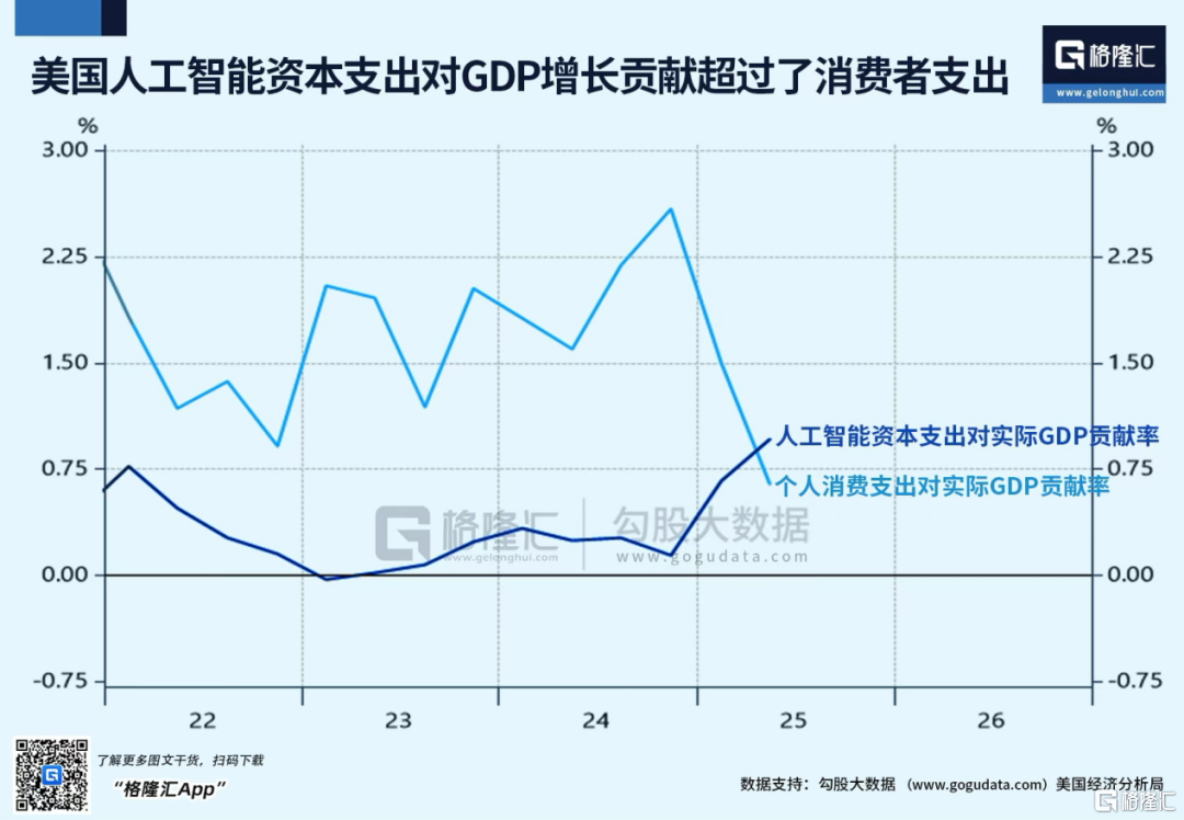 今年6月美国数据中心建设再创历史新高,年化投资首次超过400亿美元,人工智能资本支出对GDP增长贡献已经超过消费者支出了。