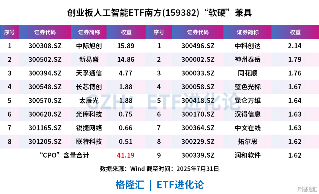 相比较而言,创业板人工智能显著超配通信(光模块)、传媒、计算机,减配电子,软硬件平衡,成分股包含CPO三大巨头“易中天”,合计含量高达41.19%,是人工智能指数中“CPO”含量最高的。