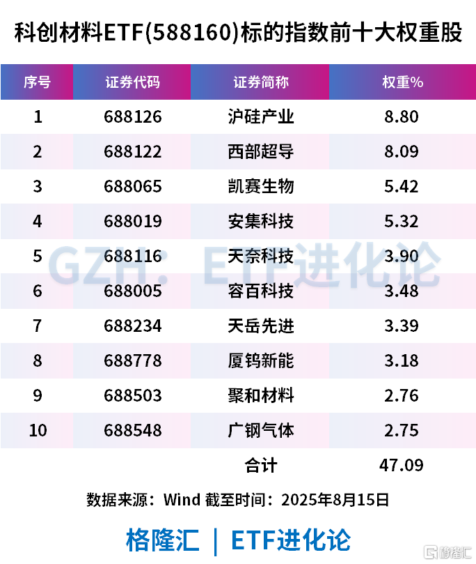 科创材料指数从科创板市场中选取50只市值较大的先进钢铁、先进有色金属、先进化工、先进无机非金属等基础材料以及关键战略材料等领域上市公司证券作为指数样本,汇聚了沪硅产业、西部超导、凯赛生物和安集科技等新材料板块的龙头企业,具有突出的硬科技属性。
