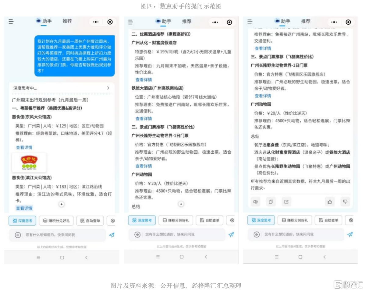 这一特性使得“数惠助手”能够为用户提供真正的“一站式”本地生活解决方案,能够站在更高维度去推理思考而非局仅限于单一平台的服务范围。用户可以通过“数惠助手”制定涵盖不同平台的吃喝玩乐一条龙定制化方案,例如同时整合美团的餐饮优惠、携程的酒店折扣和飞猪的景点门票,形成最优组合方案:如果用户打算周末订一家美团上有优惠的餐厅,同时预订携程上折扣力度大的酒店,还要买飞猪上某地域的景点门票,在这种跨平台整合需求上,“数惠助手”是不是会比只能服务美团生态的小美或多个垂直类的传统平台更有优势?