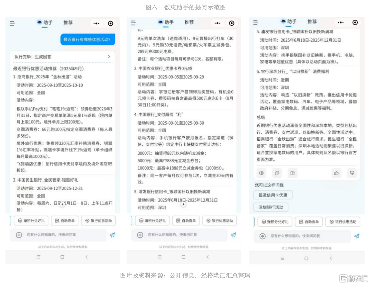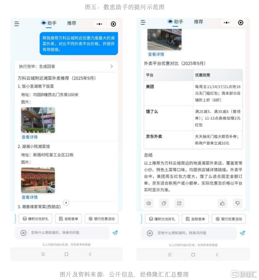 相较于美团同期发布的“小美”等依托单一生态的AI Agent产品,“数惠助手”通过跨平台整合、优惠省钱基因和银行活动场景融合三大核心优势,构建了差异化的竞争壁垒。公司与多家银行及近百家知名平台的深度合作,超4亿终端消费者的覆盖能力,以及借力微信生态及微信小程序的巨大流量和在下沉市场、年轻用户的领先渗透优势,综合形成了难以复制的资源护城河。