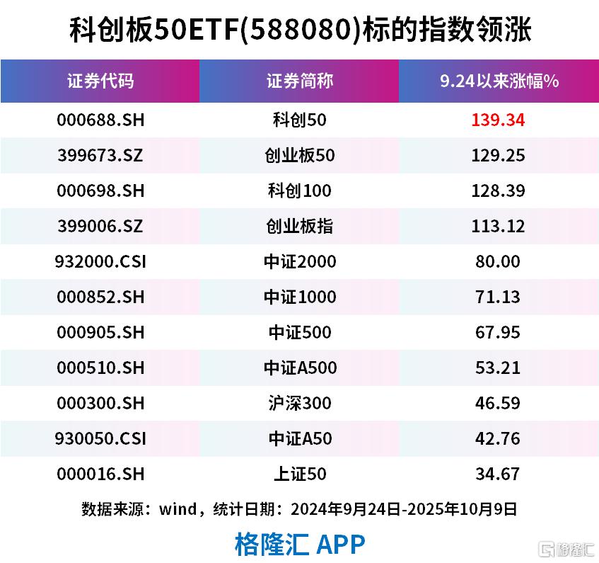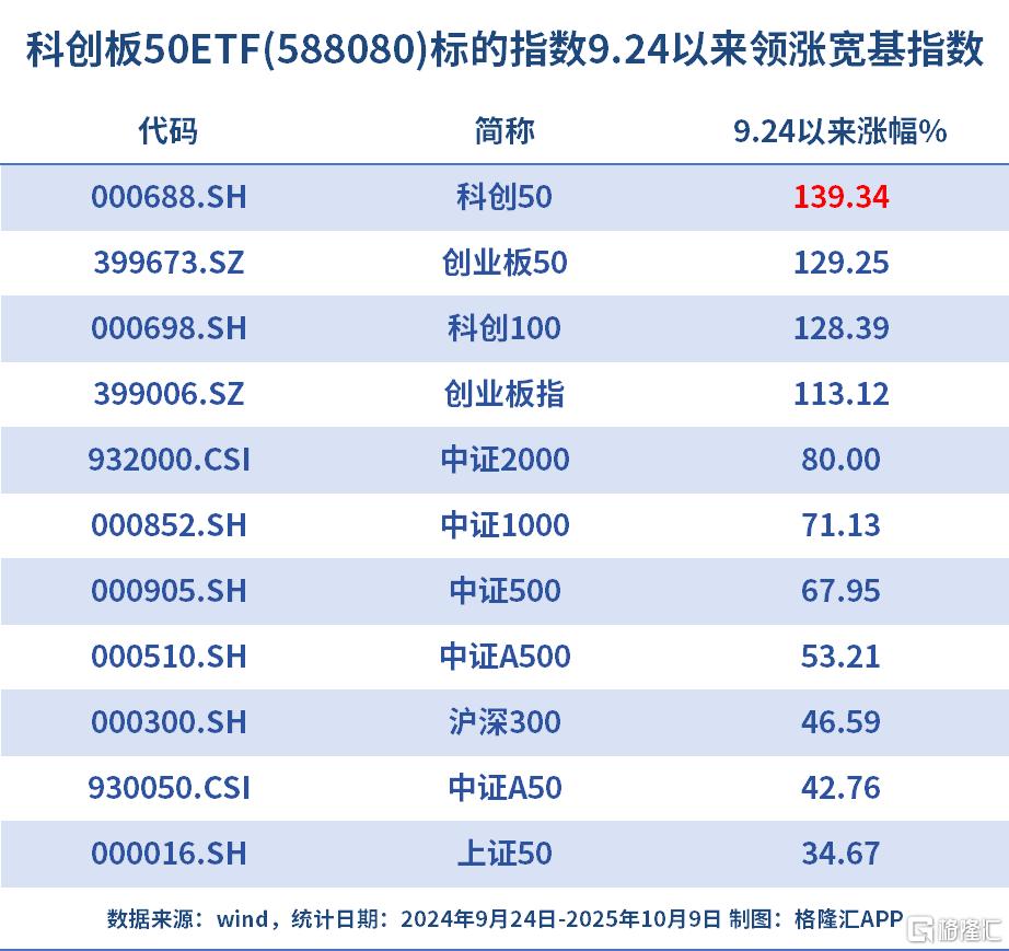 科创板50指数在历史上的业绩堪称优异。在去年9·24以来的上涨行情中,截至2025年10月9日,科创板50指数涨超139%,大幅跑赢同期创业板50、科创100、中证2000、沪深300等指数。
