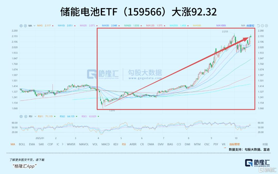 从4月9日的市场低位算起,相关的ETF录得的较大涨幅,其中,储能电池ETF(159566)涨92.32%,接近翻倍,新能源ETF易方达(516090)涨76.45%。
