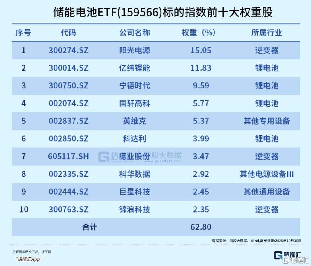 储能电池ETF跟踪国证新能源电池指数,聚焦储能产业链,权重股包括阳光电源、亿纬锂能、宁德时代、国轩高科、英维克、科达利等行业龙头。