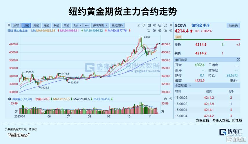 当地时间11月12日,美国结束政府停摆,代表官方经济数据将恢复发布,这将为美联储12月的降息重新带来希望。受此预期提振,国际黄金价格周三延续反弹走势,并再次突破4200美元/盎司大关。