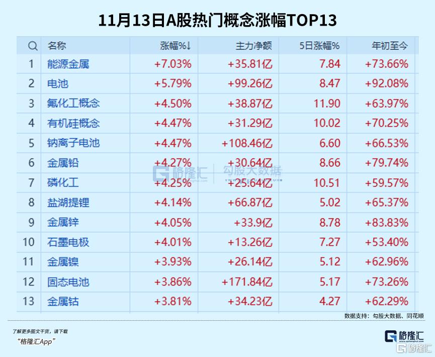 11月13日,在期货及A股市场的黄金白银,还有铜、锂、铝、铅等有色金属相关资产都再次迎来全面大涨行情,带动黄金股ETF(159562)大涨3.07%,有色金属ETF基金(516650)更是大涨4.06%,均显著跑赢大市。