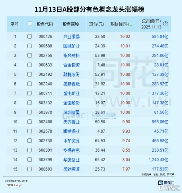 截至收盘,兴业银锡、国城矿业、永兴材料、合金投资、盛新锂能、盛屯矿业、天齐锂业等十多只股均强势封板涨停,成为全市场涨停股最多的大板块。