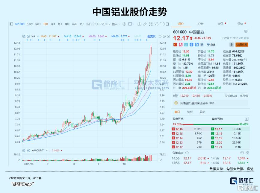 同时A股的铝板块在最近一个月也收获了巨大涨幅。其中作为国内铝业巨头的中国铝业今日A股收涨3.93%,市值突破2000亿元大关,最近两个月涨幅超过了50%。