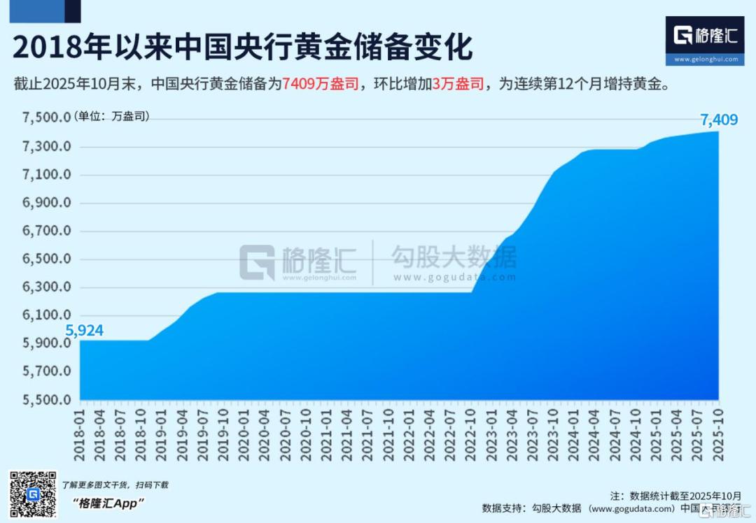 世界黄金协会调研显示,95%的受访央行计划未来12个月继续增持黄金。而就在上周,中国央行发布数据显示,中国10月末黄金储备报7409万盎司(约2304.457吨),环比增加3万盎司(约0.93吨),为连续第12个月增持黄金。