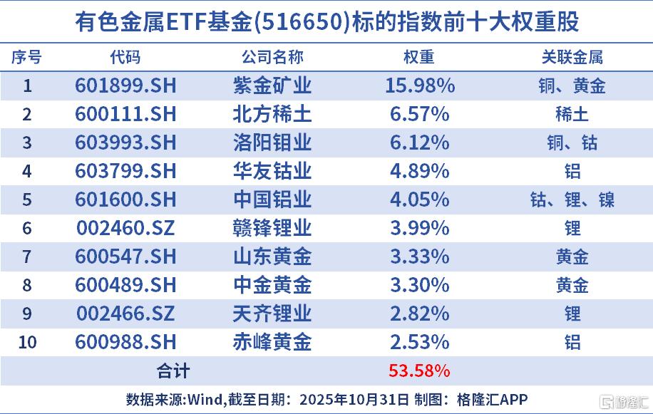 有色金属ETF基金(516650)的前十大权重股包括紫金矿业、北方稀土、洛阳钼业、华友钴业、中国铝业和赣锋锂业等,合计权重为53.58%,集度高于同类中证有色指数(48.3%),因此细分有色指数年内上涨83.05%,跑赢中证有色2.6个百分点,表现是十分优秀的。