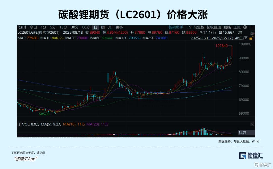 碳酸锂期货主力合约盘中涨超6%,碳酸锂2602购106000期权合约暴涨116.84%,从昨收价1900涨至4120;碳酸锂2602购108000期权合约暴涨115.15%,从昨收价1650涨至3550;碳酸锂2602购104000期权合约暴涨114.35%,从昨收价2300涨至4930。