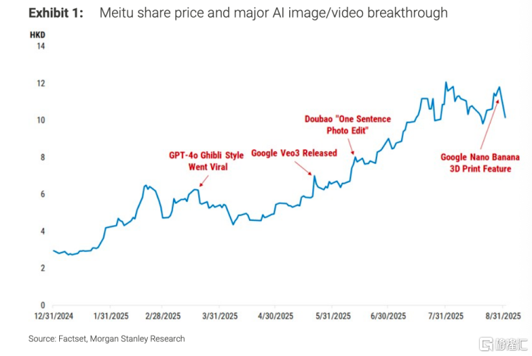 影像类AI技术突破节点的美图股价变化。来源:摩根士丹利研报