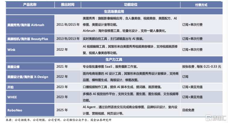 美图产品矩阵,发展侧重向生产力工具转移。来源:国金证券研报