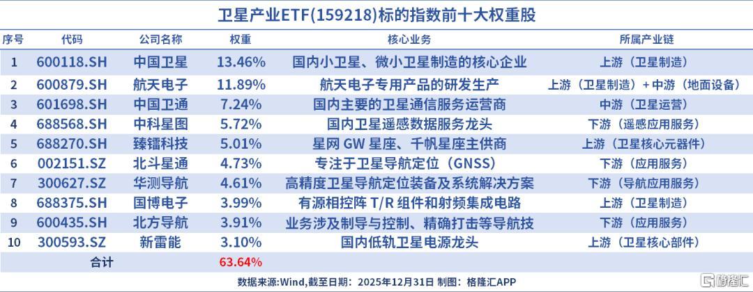 前十大权重股囊括卫星产业链上游的航天电子、中国卫星、中游的中国卫通,以及下游的华测导航、北斗星通等,合计权重超60%。