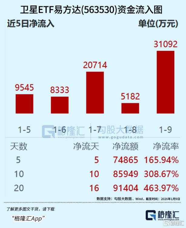 资金更是越涨越买,卫星ETF易方达(563530)周五单日“吸金”3亿,录得连续10日净申购,合计净流入8.6亿元。