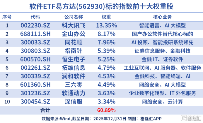 软件ETF易方达(562930)跟踪中证软件指数,30只个股全部聚焦软件开发和IT服务,前十大权重股合计占比约60.89%,龙头效应显著,深度布局AI应用层+国产替代核心标的。