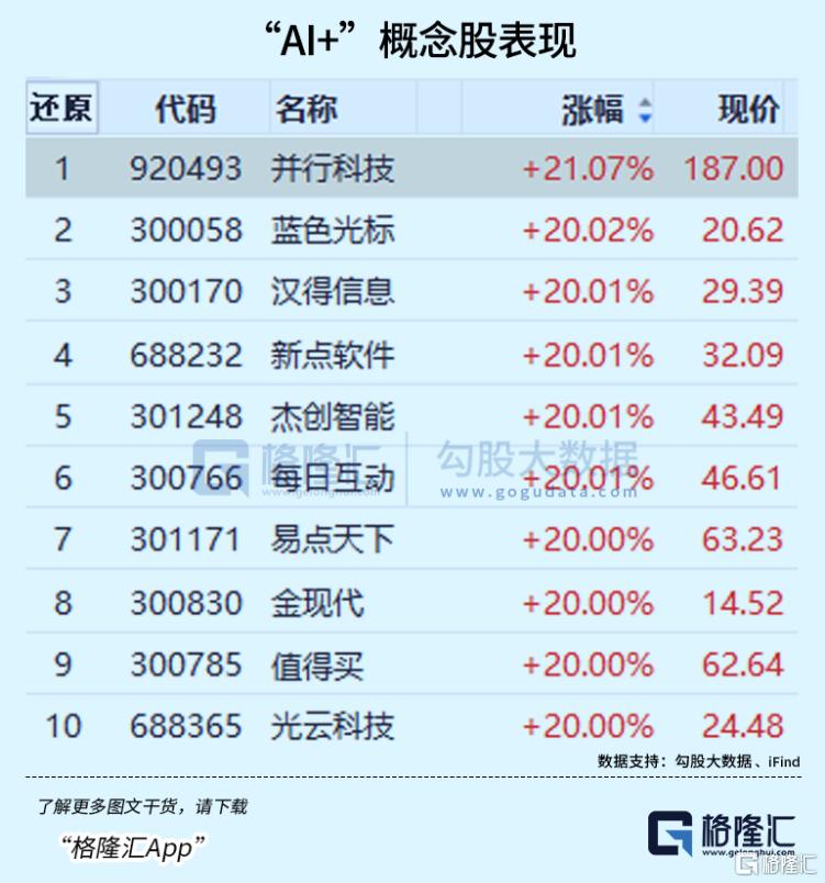 巨量成交背后,“AI+”概念今日再度爆发。