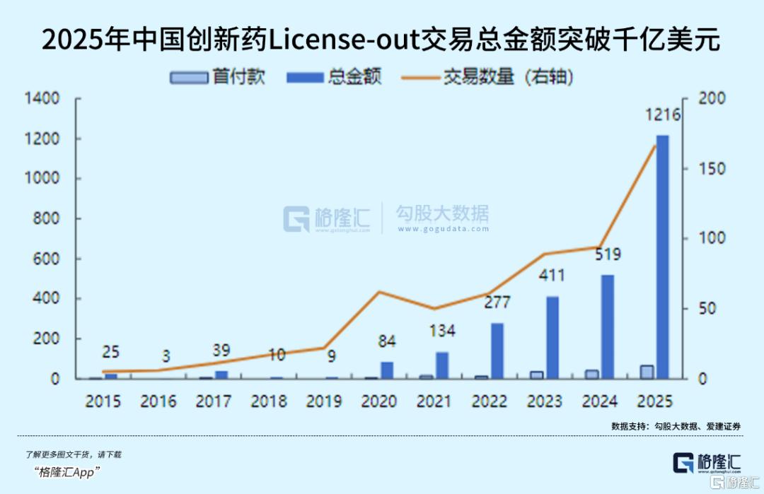 2025年,中国创新药产业迎来了历史性的“飞跃时刻”。据统计,中国药企在2025年达成了超过160笔License-out(对外授权)交易,交易总金额突破1216亿美元,同比激增两倍有余;更具标志性意义的是,这些交易带来的首付款高达65亿美元,首次超过了同期一级市场的融资总额。